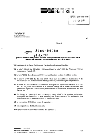 portant fixation des prix de journée hébergement et dépendance 2005 de la maison de retraite "Jean Monnet" de VILLAGE NEUF. Resumé Pièces jointes ARRETE Assemblée : Non défini Date : 14/02/2005 Rapporteur : Non défini Collectivité : Conseil départemental du Haut-Rhin Direction : Non défini Service : Service de la Tarification des Etablissements Domaine : Prix de Journée Commission :