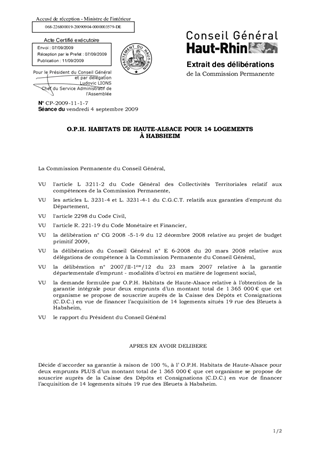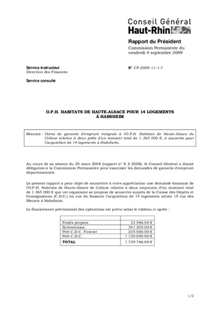 Octroi de garantie d'emprunt intégrale à l'O.P.H. Habitats de Haute-Alsace de Colmar relative à deux prêts d’un montant total de 1 365 000 €, à souscrire pour l’acquisition de 14 logements à Habsheim.