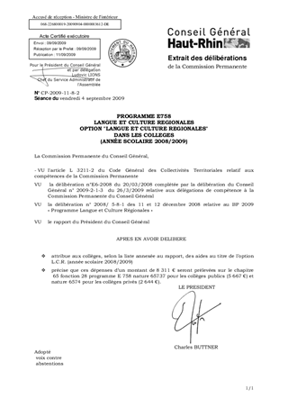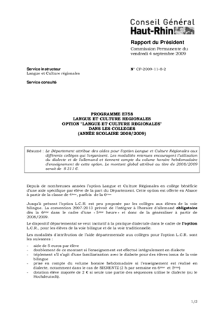 PROGRAMME E758 LANGUE ET CULTURE REGIONALES OPTION "LANGUE ET CULTURE REGIONALES" DANS LES COLLEGES (ANNÉE SCOLAIRE 2008/2009)