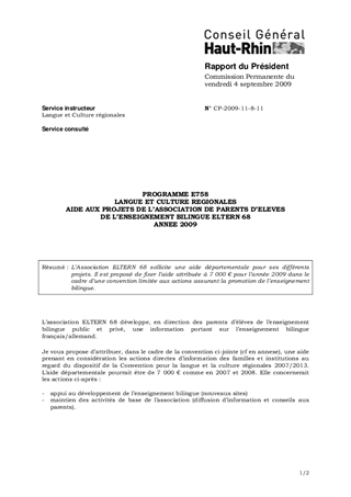L’Association ELTERN 68 sollicite une aide départementale pour ses différents projets. Il est proposé de fixer l’aide attribuée à 7 000 € pour l’année 2009 dans le cadre d’une convention limitée aux actions assurant la promotion de l’enseignement bilingue.