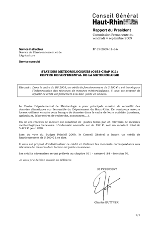 Dans le cadre du BP 2009, un crédit de fonctionnement de 5.500 € a été inscrit pour l’indemnisation des releveurs de mesures météorologiques. Il vous est proposé de répartir ce crédit conformément à la liste jointe en annexe.
