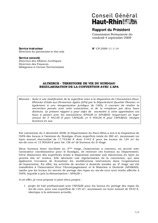 Suite à une modification de la superficie mise à la disposition de l’Association Haut-Rhinoise d'Aide aux Personnes Agées (APA) par le Département Quartier Plessier, et également à une réorganisation juridique de l'APA, il convient de résilier la convention passée avec cette association, et de la remplacer par deux baux distincts. Le présent rapport a pour objet de soumettre à votre approbation ces baux à passer avec les associations APALIB et APAMAD, moyennant un loyer annuel de 5 442,00 € pour l'APALIB, et 9 406,00 € pour l'APAMAD, charges locatives en sus.