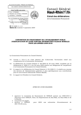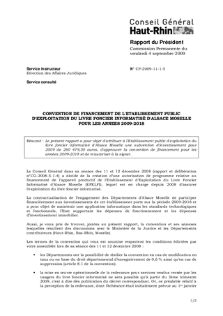 CONVENTION DE FINANCEMENT DE L'ETABLISSEMENT PUBLIC D'EXPLOITATION DU LIVRE FONCIER INFORMATISÉ D'ALSACE MOSELLE POUR LES ANNEES 2009-2018