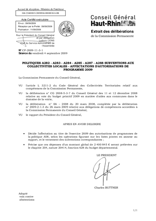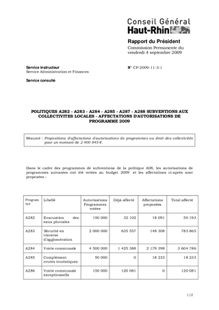 POLITIQUES A282 - A283 - A284 - A285 - A287 - A288 SUBVENTIONS AUX COLLECTIVITES LOCALES - AFFECTATIONS D'AUTORISATIONS DE PROGRAMME 2009