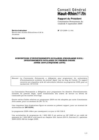 SUBVENTIONS D’INVESTISSEMENTS SCOLAIRES (PROGRAMME E252) : INVESTISSEMENTS SCOLAIRES DU PREMIER DEGRE ANNEE 2009 (CINQUIEME LISTE)
