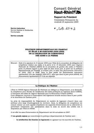 Suite à la signature le 31 janvier 2006 avec l’Etat de la convention de délégation de compétence relative aux aides à la pierre et le 19 décembre 2006 avec l’Agence Nationale de l’Habitat (ANAH) de la convention de gestion des aides à l’Habitat privé, le présent rapport a pour objet de faire d’une part, le point sur la politique départementale de l’habitat, et d’autre part, le bilan des financements intervenus en 2006, 2007 et 2008. Dans le parc public les financements intervenus représentent 53% des objectifs 2006-2011, alors que dans le parc privé (ANAH), les financements représentent 25 % de ces objectifs.