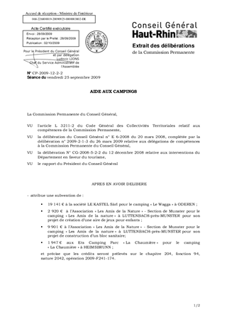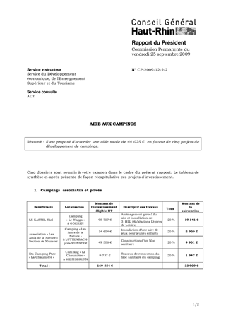 AIDE AUX CAMPINGS Resumé Il est proposé d'accorder une aide totale de 44 025 € en faveur de cinq projets de développement de campings. Pièces jointes DELIBERATION RAPPORT Assemblée : Commission Permanente Date : 25/09/2009 Rapporteur : Non défini Collectivité : Conseil départemental du Haut-Rhin Direction : Non défini Service : Service Développement Economique Domaine : Tourisme Commission : Commission Permanente