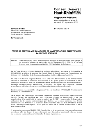 Dans le cadre du Fonds de soutien aux colloques et manifestations scientifiques, il est proposé d'allouer une subvention de fonctionnement de 3 500 € à la Nef des Sciences pour l'organisation de l'édition 2009 de la Fête de la Science.