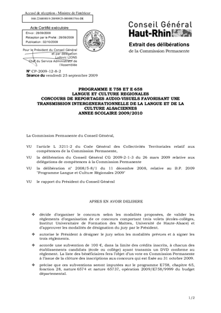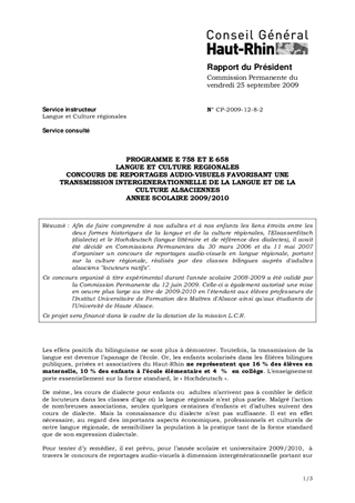 Afin de faire comprendre à nos adultes et à nos enfants les liens étroits entre les deux formes historiques de la langue et de la culture régionales, l'Elsasserditsch (dialecte) et le Hochdeutsch (langue littéraire et de référence des dialectes), il avait été décidé en Commissions Permanentes du 30 mars 2006 et du 11 mai 2007 d'organiser un concours de reportages audio-visuels en langue régionale, portant sur la culture régionale, réalisés par des classes bilingues auprès d'adultes alsaciens "locuteurs natifs". Ce concours organisé à titre expérimental durant l'année scolaire 2008-2009 a été validé par la Commission Permanente du 12 juin 2009. Celle-ci a également autorisé une mise en oeuvre plus large au titre de 2009-2010 en l'étendant aux élèves professeurs de l'Institut Universitaire de Formation des Maîtres d'Alsace ainsi qu'aux étudiants de l'Université de Haute Alsace. Ce projet sera financé dans le cadre de la dotation de la mission L.C.R.