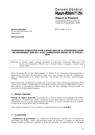 CONVENTION D'EXECUTION POUR L'ANNEE 2009 DE LA CONVENTION-CADRE DE PARTENARIAT 2009-2011 AVEC L'ASSOCIATION APALIB' DU 10 JUILLET 2009