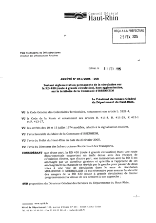 portant réglementation permanente de la circulation sur la RD 430 (route à grande circulation), hors agglomération, sur le territoire de la commune d'ISSENHEIM. Resumé Pièces jointes ARRETE Assemblée : Non défini Date : 23/02/2005 Rapporteur : Non défini Collectivité : Conseil départemental du Haut-Rhin Direction : Non défini Service : Direction des Routes Domaine : Circulation Commission :