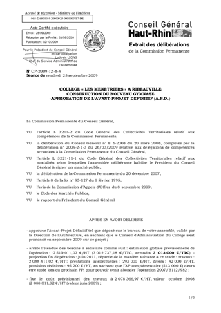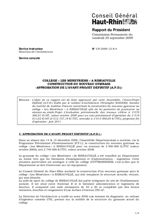 L’objet de ce rapport est de faire approuver par votre Assemblée, l’Avant-Projet Définitif (A.P.D.) établi par le cabinet d’architecture Christophe WAGNER, titulaire du marché de maîtrise d’œuvre concernant la construction du nouveau gymnase au collège « Les Ménétriers » à RIBEAUVILLE afin de lui permettre de poursuivre sa mission au stade Projet. L’évaluation prévisionnelle des travaux s’élève à 2 078 366,97 €/HT, valeur octobre 2008 pour un coût prévisionnel d’opération de 2 519 011,02 €/HT (3 012 737,18 €/TTC, arrondis à 3 013 000,00 €/TTC), projection fin d’opération : juin 2011.