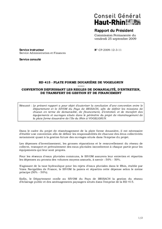 RD 415 - PLATE FORME DOUANIÈRE DE VOGELGRUN ------ CONVENTION DEFINISSANT LES REGLES DE DOMANIALITÉ, D'ENTRETIEN, DE TRANSFERT DE GESTION ET DE FINANCEMENT