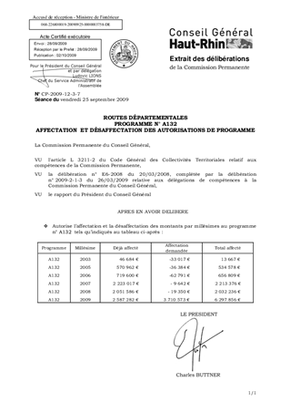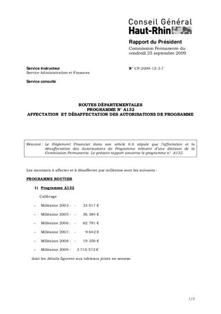 Le Règlement Financier dans son article 6.6 stipule que l’affectation et la désaffectation des Autorisations de Programme relèvent d’une décision de la Commission Permanente. Le présent rapport concerne le programme n° A132.