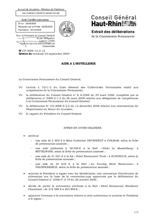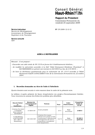 Il est proposé : - d'accorder une aide totale de 98 133 € en faveur de 4 établissements hôteliers ; - de modifier la subvention accordée à la Sàrl "Hôtel Restaurant Résidence Chambard" à KAYSERSBERG en portant son montant à 263 888 € au lieu de 218 588 € ; - de lever la déchéance quadriennale pour la subvention de 55 110 € accordée à l'Hôtel Restaurant KLEIN à SOULTZMATT lors de la Commission Permanente du 22 octobre 2004.