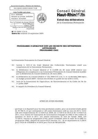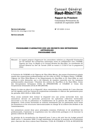 Le rapport propose d'approuver les conventions relatives au dispositif d’animation sur les déchets des entreprises artisanales mené en collaboration avec l’ADEME, l’agence de l’eau, la Région et le Conseil Général du Bas-Rhin. La contribution du Conseil Général au titre de l’année 2009 se monte à 13.520 € sur le programme C862.