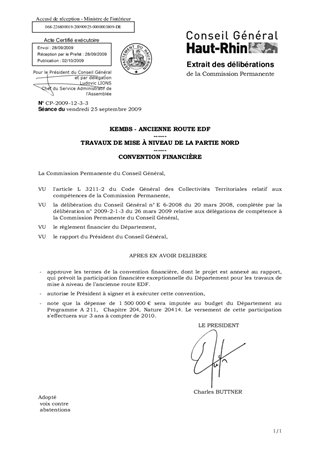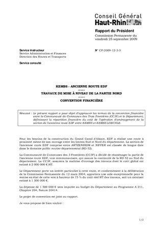 Le présent rapport a pour objet d’approuver les termes de la convention financière entre la Communauté de Communes des Trois Frontières (CC3F) et le Département, définissant la répartition financière du coût de l’opération d'aménagement de la section de l'ancienne route EDF entre KEMBS et KEMBS LOECHLE.