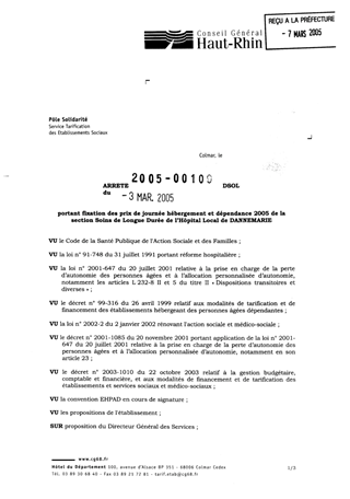 portant fixation des prix de journée hébergement et dépendance 2005 de la section soins de longue durée de l'hôpital local de DANNEMARIE. Resumé Pièces jointes ARRETE Assemblée : Non défini Date : 03/03/2005 Rapporteur : Non défini Collectivité : Conseil départemental du Haut-Rhin Direction : Non défini Service : Service de la Tarification des Etablissements Domaine : Prix de Journée Commission :