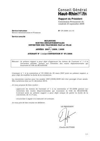 MULHOUSE ROUTES DÉPARTEMENTALES ENTRETIEN DES TRAVERSES PAR LA VILLE ----- ANNÉES 2007 / 2008 / 2009 ----- AVENANT N° 1 A LA CONVENTION N° 97/2006