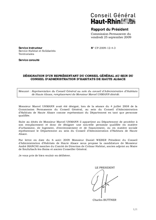 Représentation du Conseil Général au sein du conseil d’Administration d’Habitats de Haute Alsace, remplacement de Monsieur Marcel UHMANN décédé.