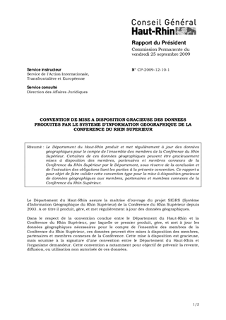 Le Département du Haut-Rhin produit et met régulièrement à jour des données géographiques pour le compte de l’ensemble des membres de la Conférence du Rhin Supérieur. Certaines de ces données géographiques peuvent être gracieusement mises à disposition des membres, partenaires et membres connexes de la Conférence du Rhin Supérieur par le Département, sous réserve de la conclusion et de l’exécution des obligations liant les parties à la présente convention. Ce rapport a pour objet de faire valider cette convention type pour la mise à disposition gracieuse de données géographiques aux membres, partenaires et membres connexes de la Conférence du Rhin Supérieur.