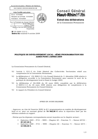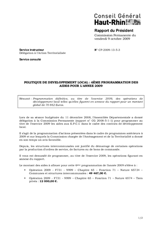 Programmation définitive, au titre de l'exercice 2009, des opérations de développement local telles qu'elles figurent en annexe du rapport pour un montant global de 70 862 Euros.