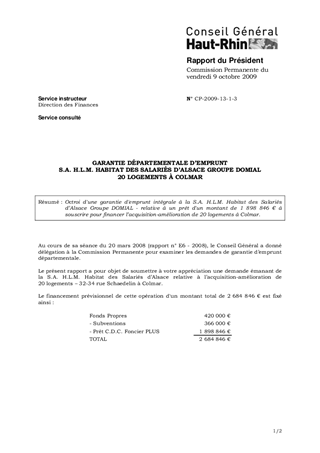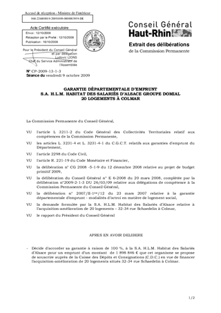 GARANTIE DÉPARTEMENTALE D’EMPRUNT S.A. H.L.M. HABITAT DES SALARIÉS D’ALSACE GROUPE DOMIAL 20 LOGEMENTS À COLMAR