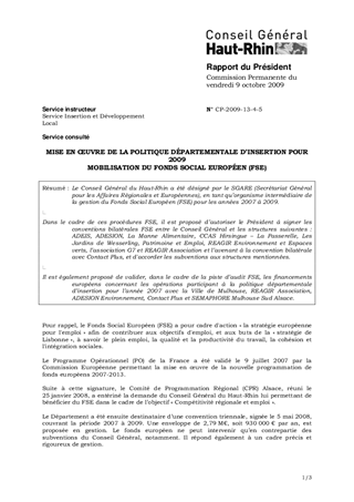 MISE EN ŒUVRE DE LA POLITIQUE DÉPARTEMENTALE D’INSERTION POUR 2009 MOBILISATION DU FONDS SOCIAL EUROPÉEN (FSE)