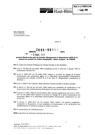 portant fixation des prix de journée hébergement et dépendance 2005 de la maison de retraite du centre hospitalier "Saint Jacques" de THANN. Resumé Pièces jointes ARRETE Assemblée : Non défini Date : 03/03/2005 Rapporteur : Non défini Collectivité : Conseil départemental du Haut-Rhin Direction : Non défini Service : Service de la Tarification des Etablissements Domaine : Prix de Journée Commission :