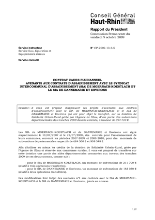 Il vous est proposé d’approuver les projets d’avenants aux contrats d’assainissement avec le SIA de MOERNACH-KOESTLACH et le SIA de DANNEMARIE et Environs qui ont pour objet le transfert, sur la dotation de Solidarité Urbain-Rural gérée par l'Agence de l'Eau, d’une partie des subventions départementales des tranches 2009 desdits contrats, à hauteur de 394 730 €.