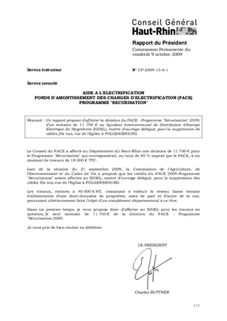 Ce rapport propose d'affecter la dotation du FACE - Programme "Sécurisation" 2009, d'un montant de 11 700 € au Syndicat Intercommunal de Distribution d'Energie Electrique de Hégenheim (SIDEL), maître d'ouvrage délégué, pour la suppression de câbles fils nus, rue de l'Eglise à FOLGENSBOURG.