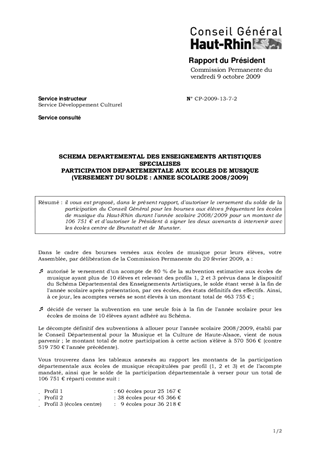 il vous est proposé, dans le présent rapport, d'autoriser le versement du solde de la participation du Conseil Général pour les bourses aux élèves fréquentant les écoles de musique du Haut-Rhin durant l'année scolaire 2008/2009 pour un montant de 106 751 € et d’autoriser le Président à signer les deux avenants à intervenir avec les écoles centre de Brunstatt et de Munster.
