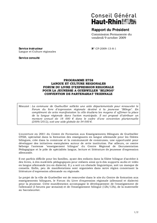 La commune de Guebwiller sollicite une aide départementale pour renouveler le Forum du livre d’expression régionale destiné à la jeunesse "Bilingo". En complément de cette manifestation la ville étudiera les moyens d' affirmer la place de la langue régionale dans l'action municipale. Il est proposé d’attribuer un montant annuel de 18 000 € dans le cadre d’une convention pluriannuelle (2009/2012), soit une aide globale de 54 000 €.