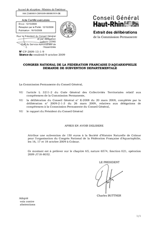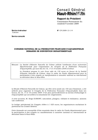 La Société d'Histoire Naturelle de Colmar sollicite l'attribution d'une subvention départementale pour l'organisation du Congrès de la Fédération Française d'Aquariophilie, qui aura lieu les 16, 17 et 18 octobre 2009 à Colmar. Le Président propose le vote d'une aide de 150 euros en faveur de la Société d'Histoire Naturelle de Colmar, dans le cadre du Fonds départemental pour la participation à des congrès ou manifestations à caractère national ou international se déroulant dans le Haut-Rhin.