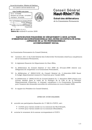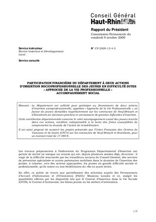 Le Département est sollicité pour participer au financement de deux actions d’insertion socioprofessionnelle, appelées « Approche de la Vie Professionnelle », en faveur de jeunes domiciliés majoritairement sur les communes de Neuf-Brisach et d’Ensisheim (et alentours proches) et connaissant de grandes difficultés d’insertion. Cette contribution départementale concerne le volet accompagnement social des jeunes inscrits dans ces actions, condition indispensable à la levée des freins susceptibles de compromettre la réussite de l’action de remobilisation. Il est ainsi proposé de soutenir les projets présentés par l’Union Française des Centres de Vacances et de loisirs (UFCV) sur les communes de Neuf-Brisach et Ensisheim, pour un montant total de 17 080 €.
