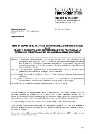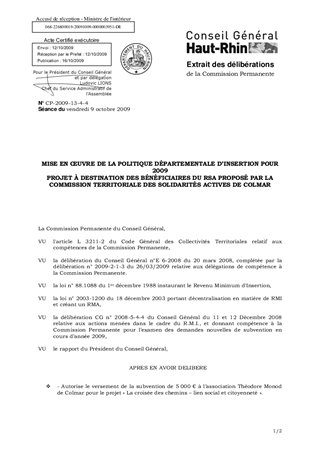 MISE EN ŒUVRE DE LA POLITIQUE DÉPARTEMENTALE D’INSERTION POUR 2009 PROJET À DESTINATION DES BÉNÉFICIAIRES DU RSA PROPOSÉ PAR LA COMMISSION TERRITORIALE DES SOLIDARITÉS ACTIVES DE COLMAR