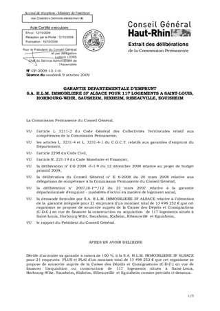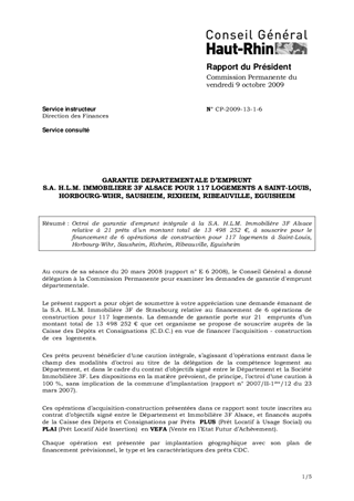 GARANTIE DEPARTEMENTALE D’EMPRUNT S.A. H.L.M. IMMOBILIERE 3F ALSACE POUR 117 LOGEMENTS A SAINT-LOUIS, HORBOURG-WIHR, SAUSHEIM, RIXHEIM, RIBEAUVILLE, EGUISHEIM