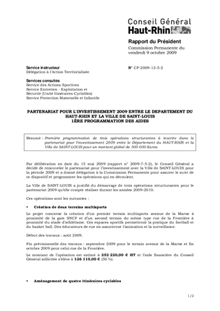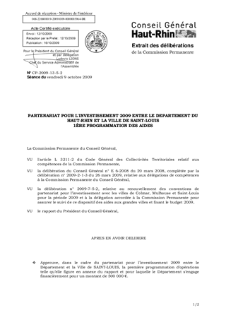 PARTENARIAT POUR L'INVESTISSEMENT 2009 ENTRE LE DEPARTEMENT DU HAUT-RHIN ET LA VILLE DE SAINT-LOUIS 1ÈRE PROGRAMMATION DES AIDES