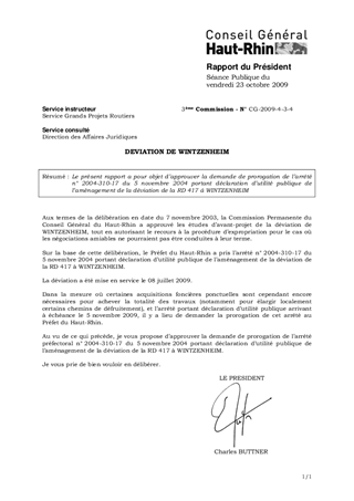 Le présent rapport a pour objet d’approuver la demande de prorogation de l’arrêté n° 2004-310-17 du 5 novembre 2004 portant déclaration d’utilité publique de l’aménagement de la déviation de la RD 417 à WINTZENHEIM
