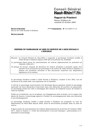 Le Conseil Général du Haut-Rhin a suspendu le parrainage d'enfants confiés à l'Aide Sociale à l'Enfance depuis 2000 afin d'en préciser les modalités. Le parrainage figure parmi les préconisations du schéma départemental de protection de l'enfance 2006-2011. Un groupe de travail, composé de directeurs de maison d'enfants à caractère social, d'un membre d'une association de parrainage et de cadres de l'Aide Sociale à l'Enfance a élaboré une procédure sécurisée et des documents conformes aux dispositions législatives en la matière.