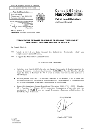 FINANCEMENT DU POSTE DE CHARGE DE MISSION "TOURISME ET PATRIMOINE" DU SIVOM DU PAYS DE BRISACH