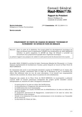 Dans le cadre de la définition d'un projet global de développement touristique du Pays de Brisach dont la labellisation UNESCO des fortifications de NEUF-BRISACH constitue la pierre angulaire, le SIVOM du Pays de Brisach a procédé au recrutement d'un professionnel qualifié dans l'ingénierie touristique. Le présent rapport vous propose de valider le cadre partenarial de financement de ce poste.