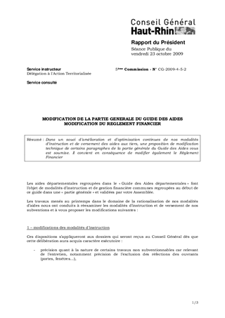 MODIFICATION DE LA PARTIE GENERALE DU GUIDE DES AIDES MODIFICATION DU REGLEMENT FINANCIER