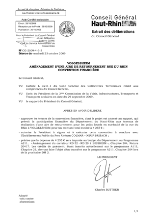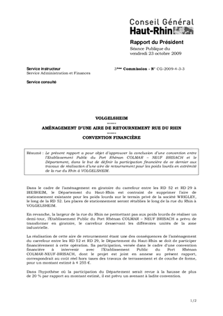 Le présent rapport a pour objet d’approuver la conclusion d’une convention entre l’Etablissement Public du Port Rhénan COLMAR – NEUF BRISACH et le Département, dans le but de définir la participation financière de ce dernier aux travaux de réalisation d’une aire de retournement pour les poids lourds en extrémité de la rue du Rhin à VOLGELSHEIM.