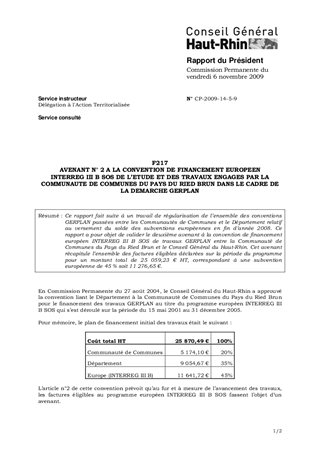 F217 AVENANT N° 2 A LA CONVENTION DE FINANCEMENT EUROPEEN INTERREG III B SOS DE L’ETUDE ET DES TRAVAUX ENGAGES PAR LA COMMUNAUTE DE COMMUNES DU PAYS DU RIED BRUN DANS LE CADRE DE LA DEMARCHE GERPLAN