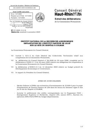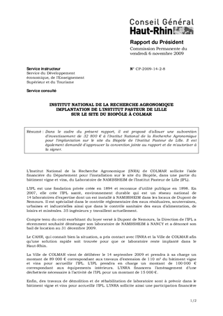INSTITUT NATIONAL DE LA RECHERCHE AGRONOMIQUE IMPLANTATION DE L'INSTITUT PASTEUR DE LILLE SUR LE SITE DU BIOPÔLE À COLMAR