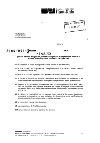 portant fixation des prix de journée hébergement et dépendance 2005 de la maison de retraite "Les Erables" à GUEBWILLER. Resumé Pièces jointes ARRETE Assemblée : Non défini Date : 08/03/2005 Rapporteur : Non défini Collectivité : Conseil départemental du Haut-Rhin Direction : Non défini Service : Service de la Tarification des Etablissements Domaine : Prix de Journée Commission :