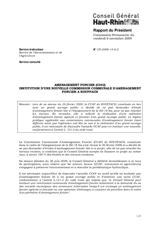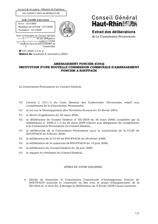 Lors de sa séance du 26 février 2008, la CCAF de ROUFFACH, constituée en lien avec un grand ouvrage public, a décidé de ne pas demander d'étude d'aménagement foncier liée à l’élargissement de la RD 18 bis, pour ne pas retarder les travaux. En revanche, elle a sollicité la réalisation d’une opération d'aménagement foncier agricole et forestier hors grand ouvrage public. Le régime juridique applicable aux commissions communales d’aménagement foncier étant différent selon que l’opération soit liée ou non à la réalisation d’un grand ouvrage public, il est nécessaire de dissoudre l'actuelle CCAF pour en instituer une nouvelle, conformément à l'article L. 121-2 du code rural.