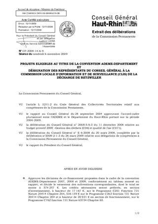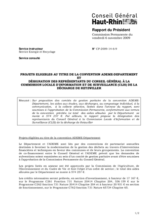 PROJETS ELIGIBLES AU TITRE DE LA CONVENTION ADEME-DEPARTEMENT ET DÉSIGNATION DES REPRÉSENTANTS DU CONSEIL GÉNÉRAL À LA COMMISSION LOCALE D'INFORMATION ET DE SURVEILLANCE (CLIS) DE LA DÉCHARGE DE RETZWILLER