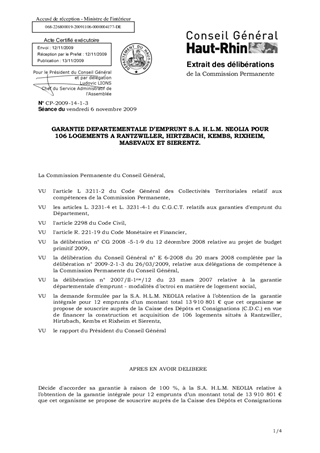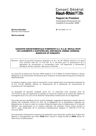 GARANTIE DEPARTEMENTALE D’EMPRUNT S.A. H.L.M. NEOLIA POUR106 LOGEMENTS A RANTZWILLER, HIRTZBACH, KEMBS, RIXHEIM, MASEVAUX ET SIERENTZ.